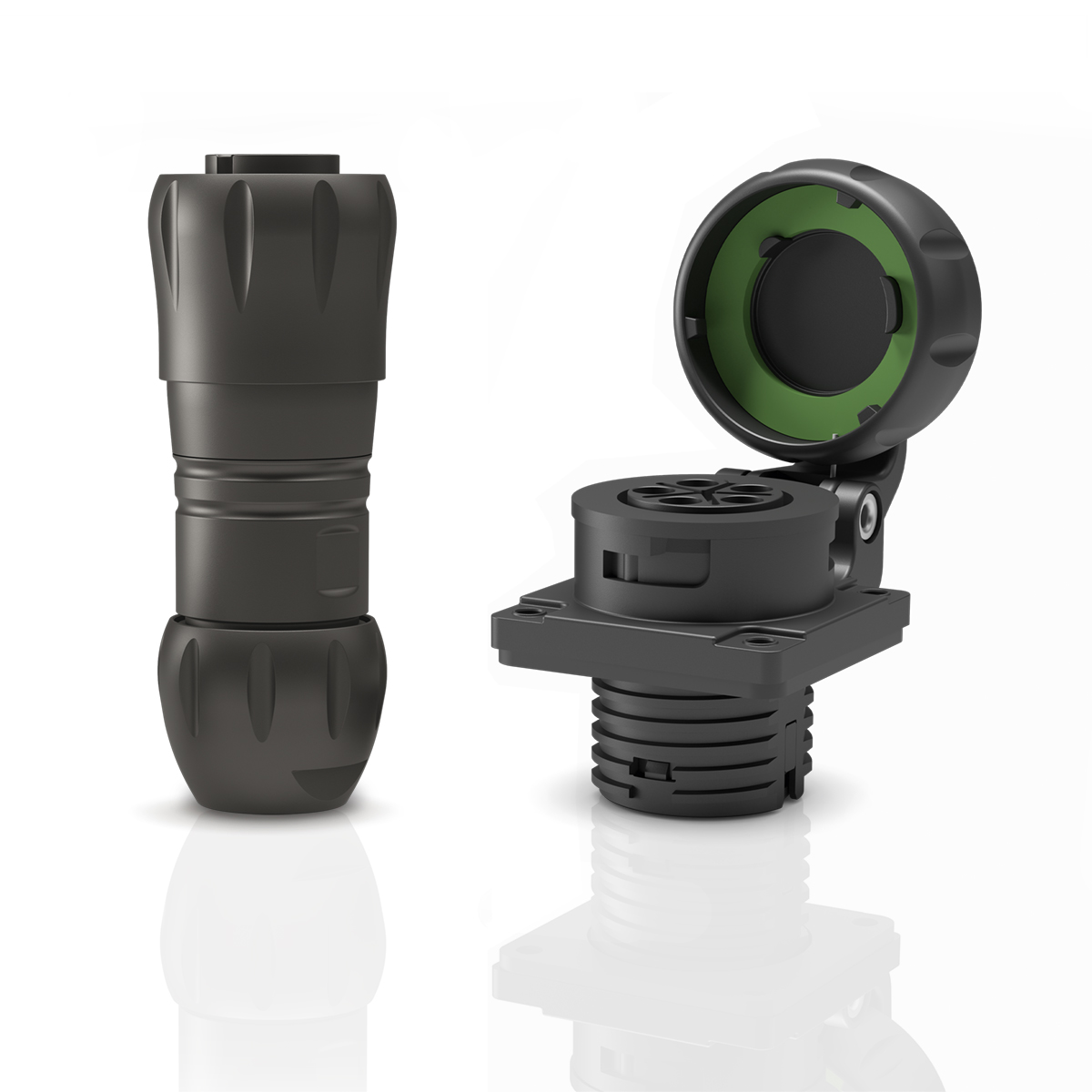 Steckverbinder für raue Umgebungen der HEC-Serie 696 (Harsh Environment Connectors) gibt es als Vierkant-Flansch- und Kabelausführungen mit integriertem Schutzschlauch, der Kabel bis IP67 und im gesteckten Zustand bis IP69K schützen kann. Die Steckverbinder sind UV-beständig und haben eine VDE- sowie UL-Zulassung. Die hohe mechanische Belastbarkeit der Produkte wird durch mehr als 500 Steckzyklen bei der 12-poligen Variante und mehr als 1000 Steckzyklen bei der 5- und 8-Pol Ausführung bestätigt.